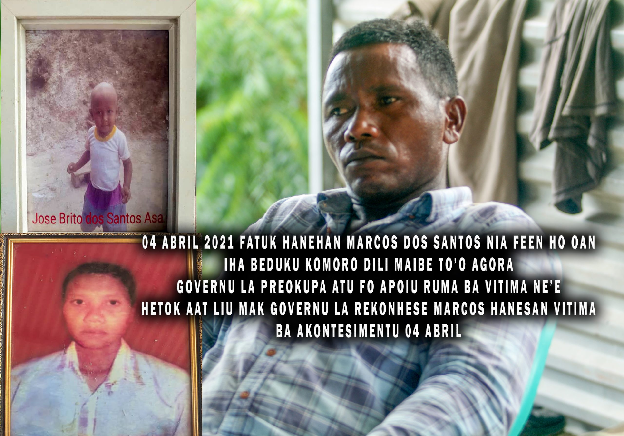 Vítima inundasaun 4 Abril, Marcos dos Santos konta, momentu akontesimentu mosu inundasaun iha loron 04 abríl 2021, Marcos lakon nia feen ho oan no sasán uma laran inklui uma ne’ebé mak antes ne’e sira hela iha Beduku Komoro neebe fatuk hanehan, maibé to’o agora vítima inundasaun ne’e la hetan buat ruma husi parte governu.